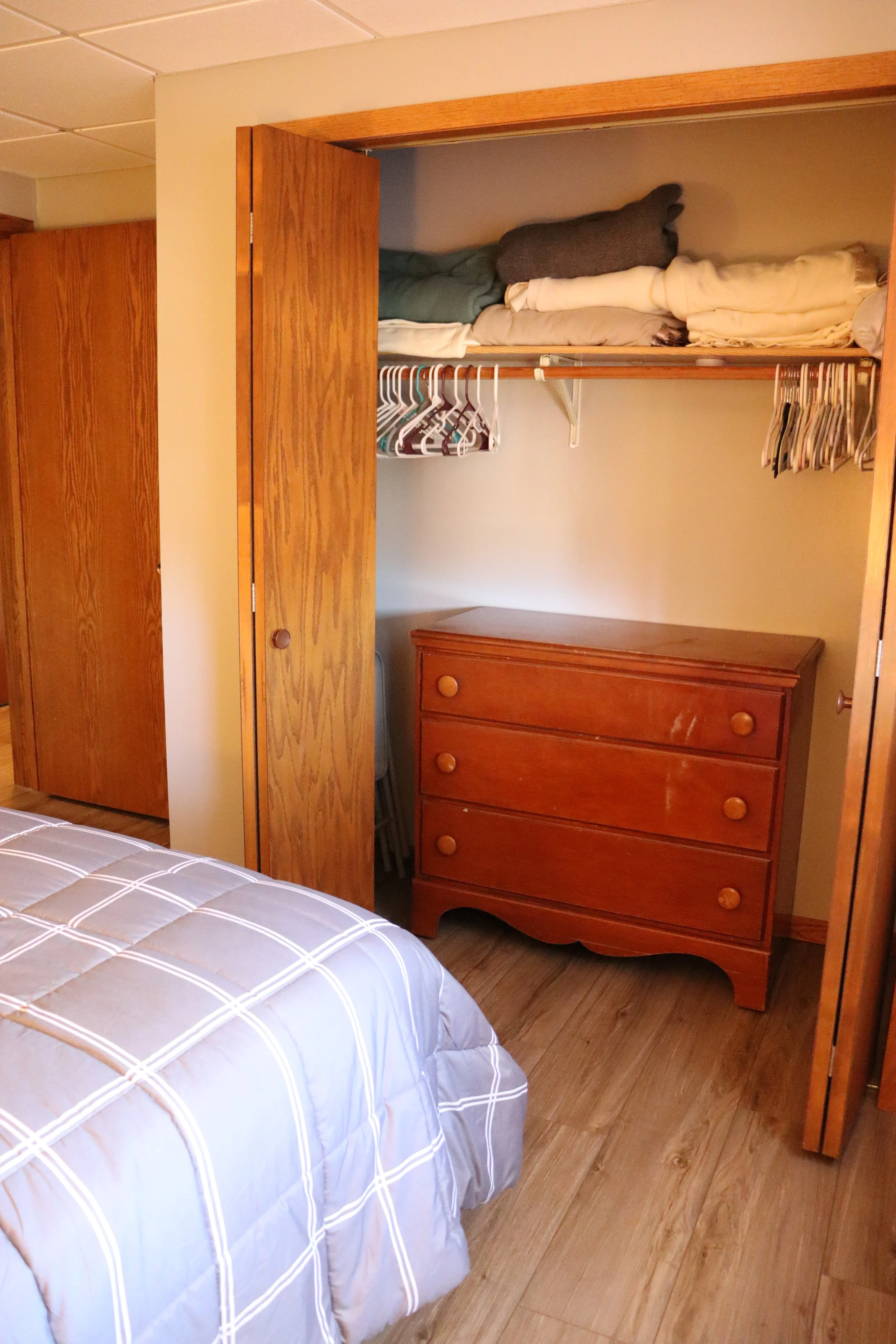 This bedroom has two twin beds, a dresser, and a small closet.
